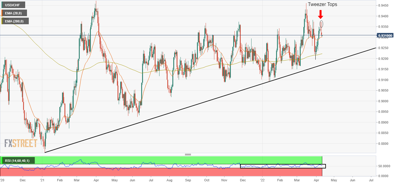 美元/瑞郎未能维持在前数周高位 0.9374 上方后出现大幅下跌。美元/瑞郎已被大幅打压至 20 周期指数均线 (EMA) 附近,交投于 0.9300。