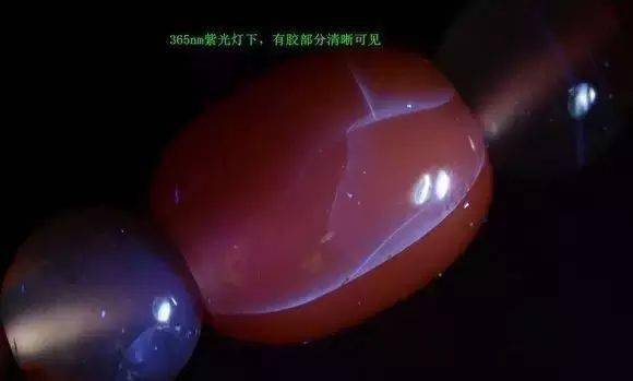 下面是波长365nm紫光灯下的效果,看出胶了吧?365nm灯光下,胶还是裂,好区分了吧?↓↓↓