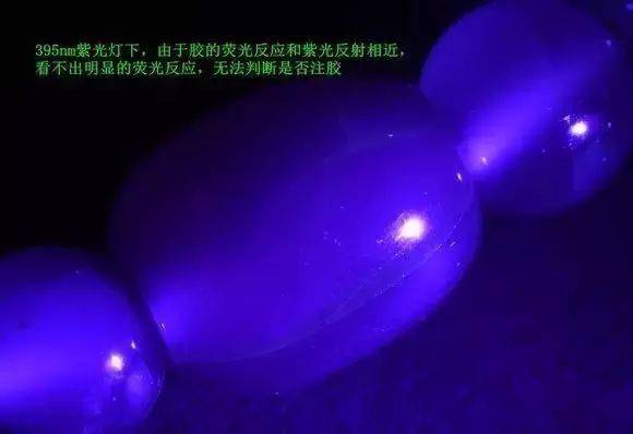 2、注胶不分贵贱,价格高的和低的都有,肉眼有些能看出来,特别胶的颜色深的或偏绿的,能看出来,这类胶一般紫光灯下荧光黄绿色,用市面常用的验钞紫光灯都可以检测出。另一种色色浅,在紫光灯下灰白色,市面395紫光灯下不宜区分,需要365紫光灯。