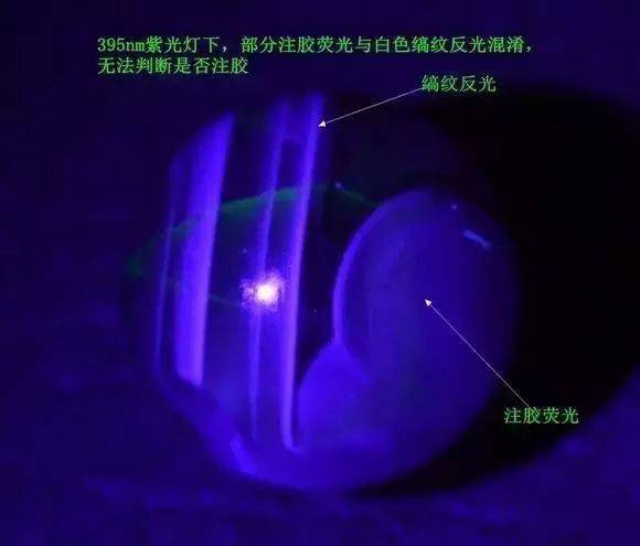 下面是用市面上常见的波长5nm紫光灯照射下的效果,看出胶了吗?这个是裂还是注胶啊?↓↓↓